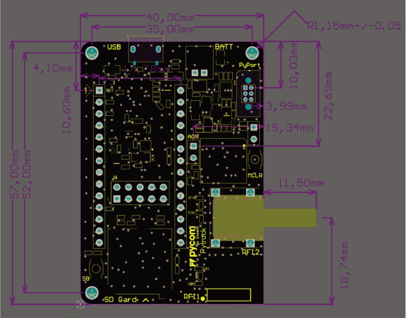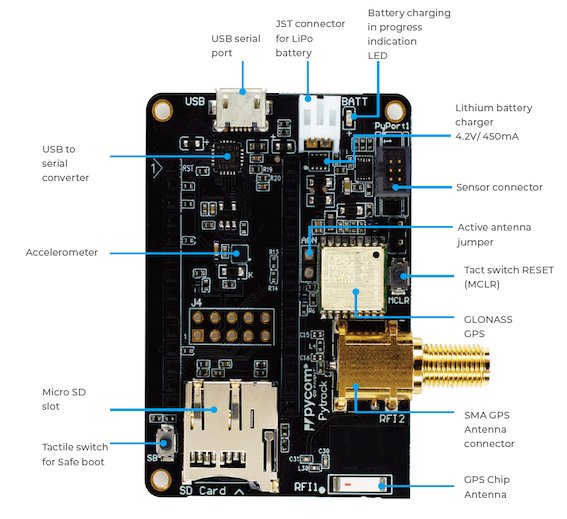 The Pytrack 2.0 X features a SMA connector that allows for the connection of an external active or passive GPS antenna. The SMA connector has an internal switch that switches the connection from the internal to the external antenna automatically upon connection of the external antenna.