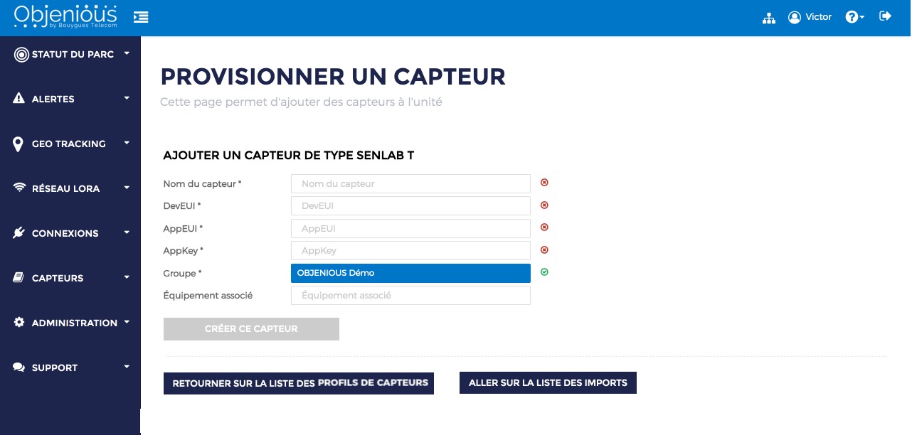 Follow “Importer des capteurs” under “Statuc do Parc” and select “Provisioning Unitaire”:
