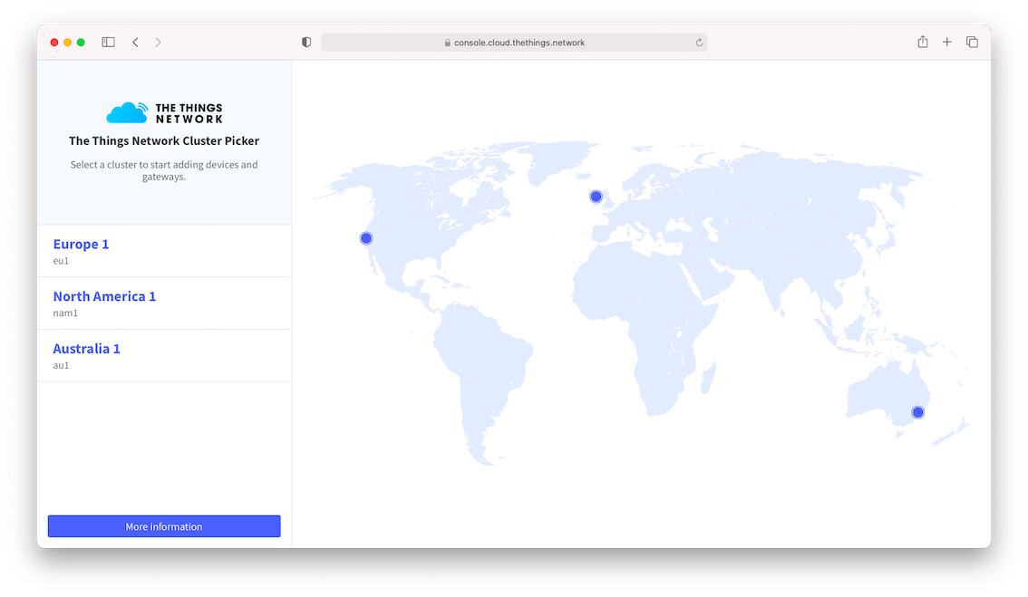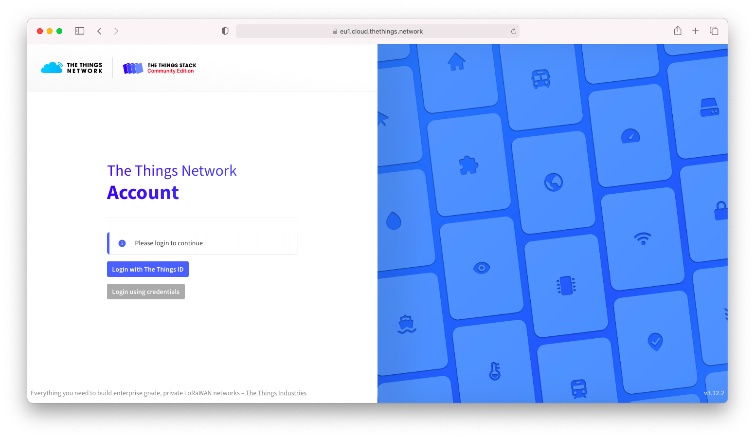 In order to use TTS you should navigate to https://console.cloud.thethings.network and select your region. Following that, either login using your account, or create a new one. Already existing accounts on The Things Network (TTN) should work here as well.