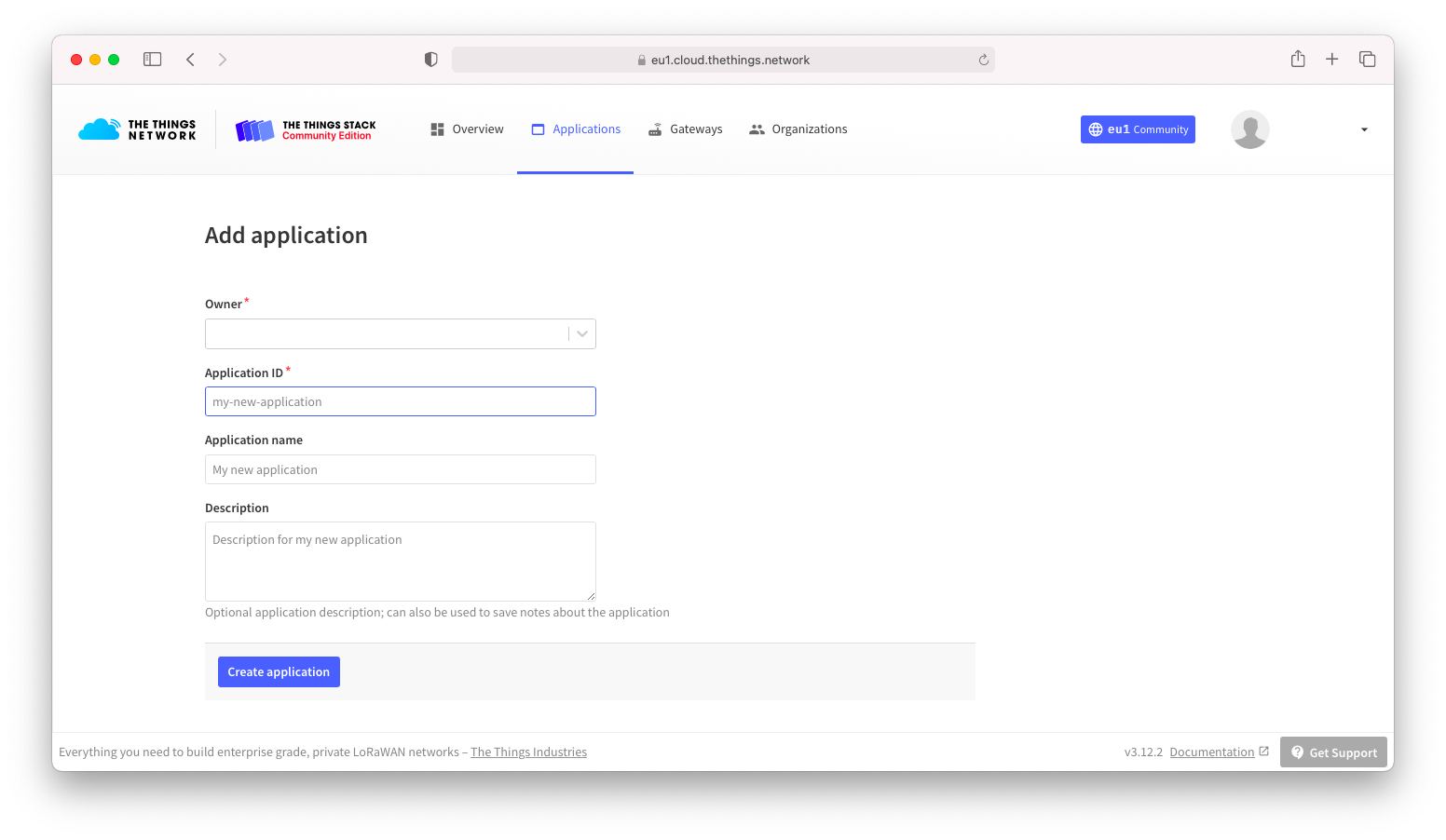Selecting the Applications tab at the top of the TTN console, will bring up a screen for registering applications.