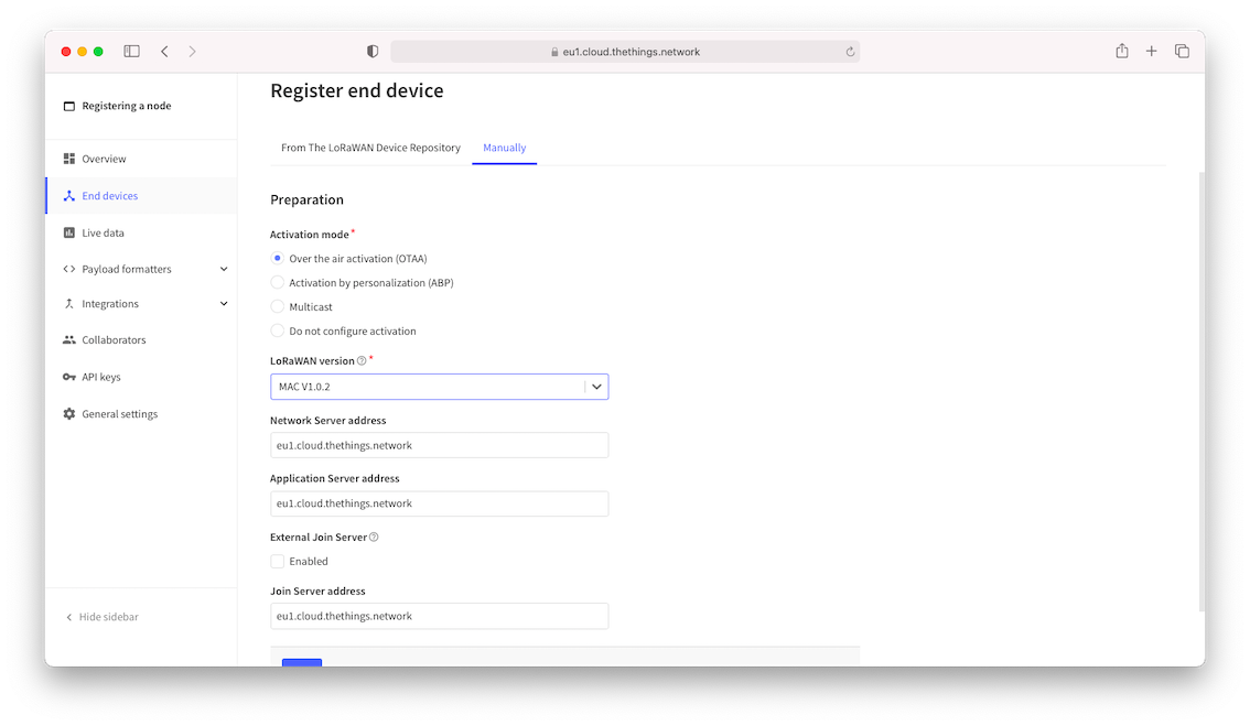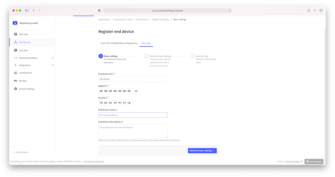 • The End device ID is a unique name for the device we’re about to register, you can choose something that makes sense for your project.