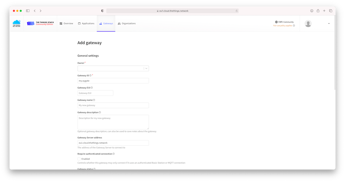 These are unique to each gateway, location and country specific frequency. Please verify that correct settings are selected otherwise the gateway will not connect to TTN. Further down the page, you will have to select a frequency plan. Select the one appropriate for your region and/or the one compatible with your nodes. After that, you can create the gateway.
