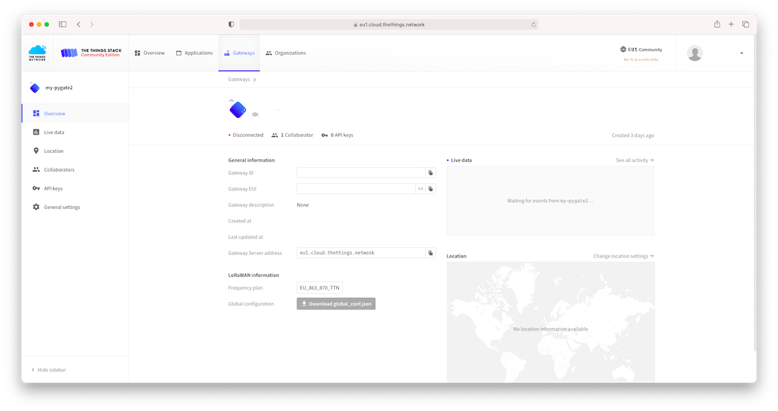 From here, you can select to download global_conf.json for your selected region. Please check the file for the correct server_address and gateway_ID. This file can be used for configuring the Pygate.