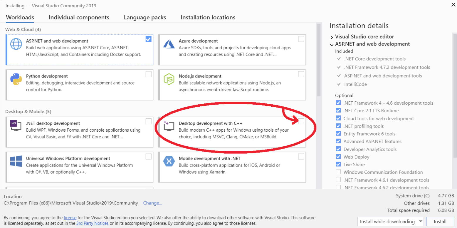 Download Microsoft Visual C++ (https://visualstudio.microsoft.com/downloads/#build-tools-for-visual-studio-2019) and install the community edition.