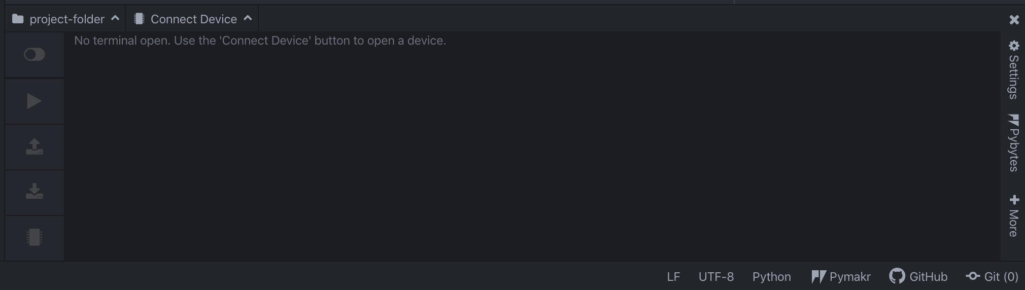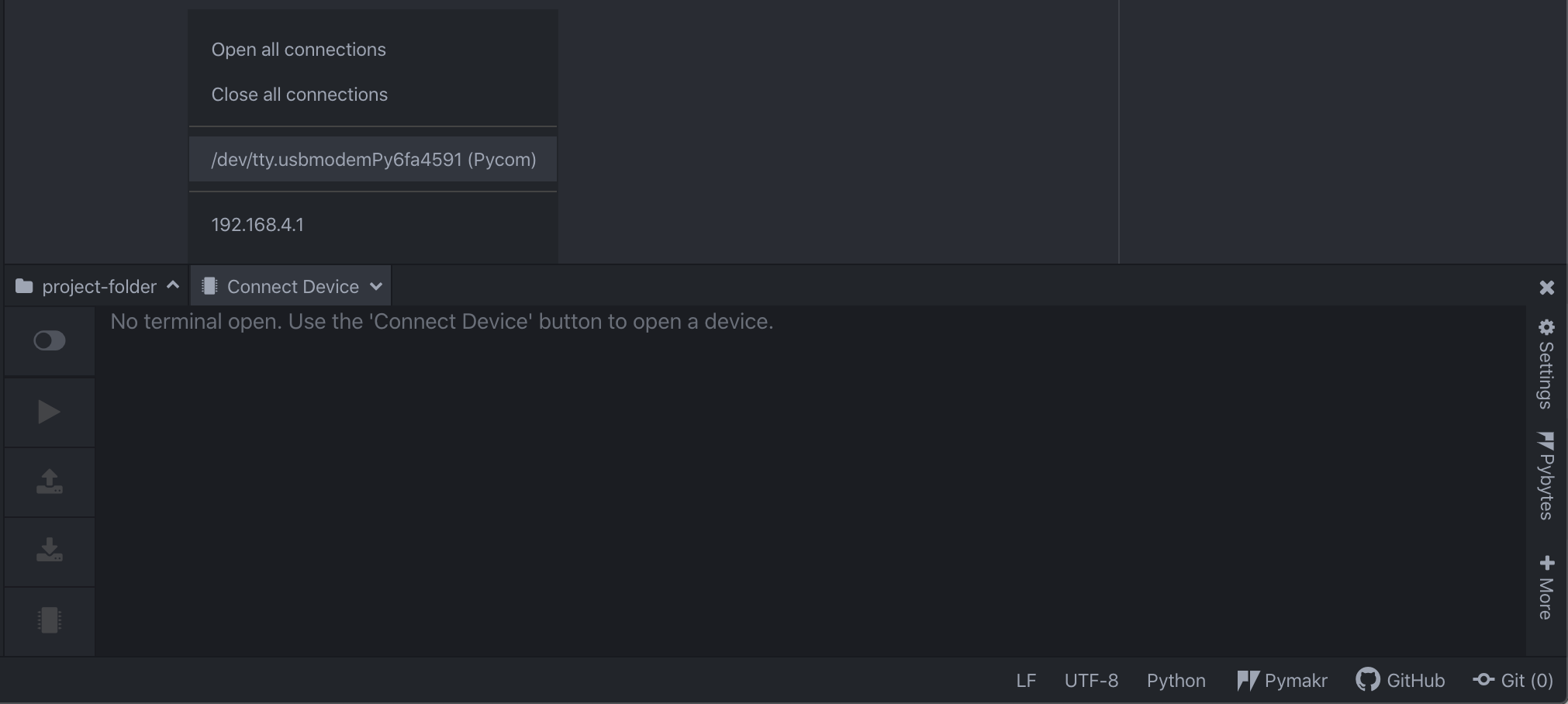Pymakr has auto-connection enabled by default. In case your device hasn’t connected right away, click on Connect device and then on your device.