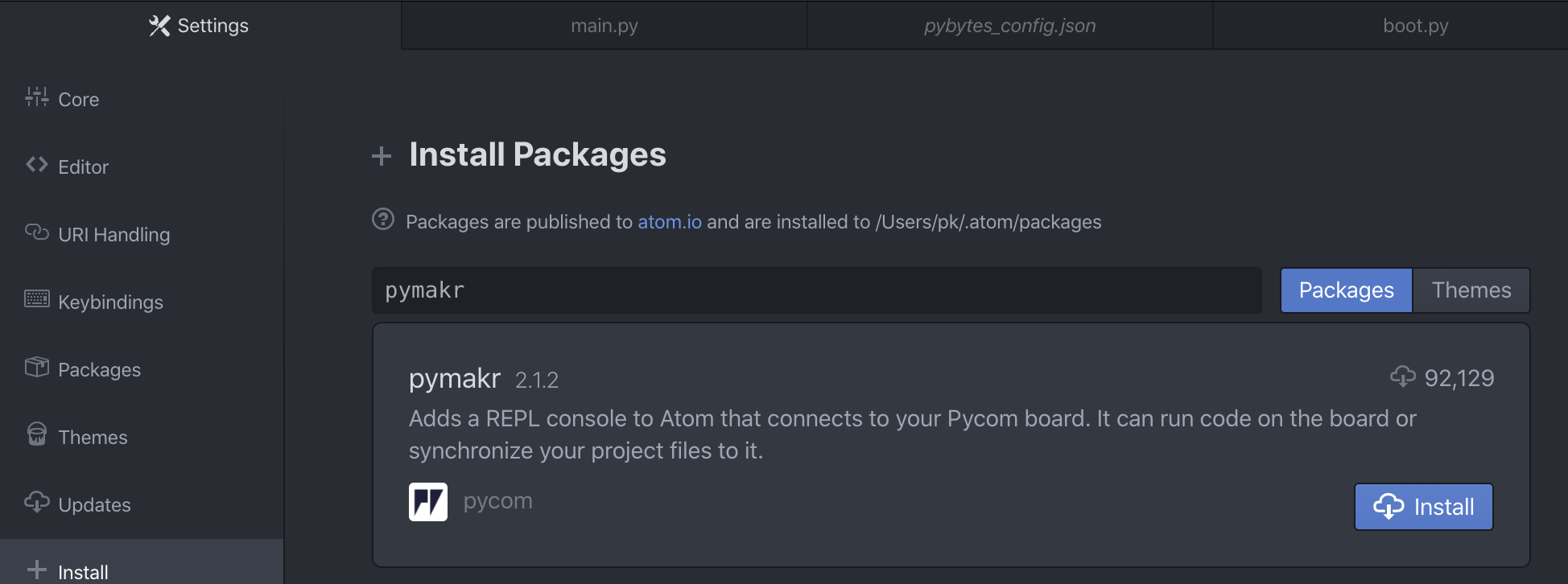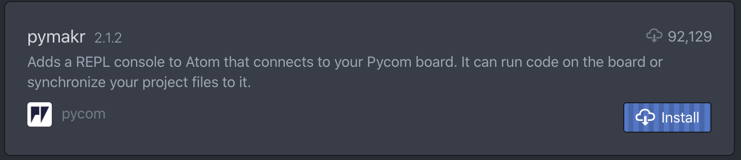 For beginners, users getting started with MicroPython & Pycom as well as Atom text editor users, we recommend the Pymakr Plugin for Atom. This section will help you get started using the Atom Text Editor & Pymakr Plugin.Please follow these steps to install the Pymakr Plugin: