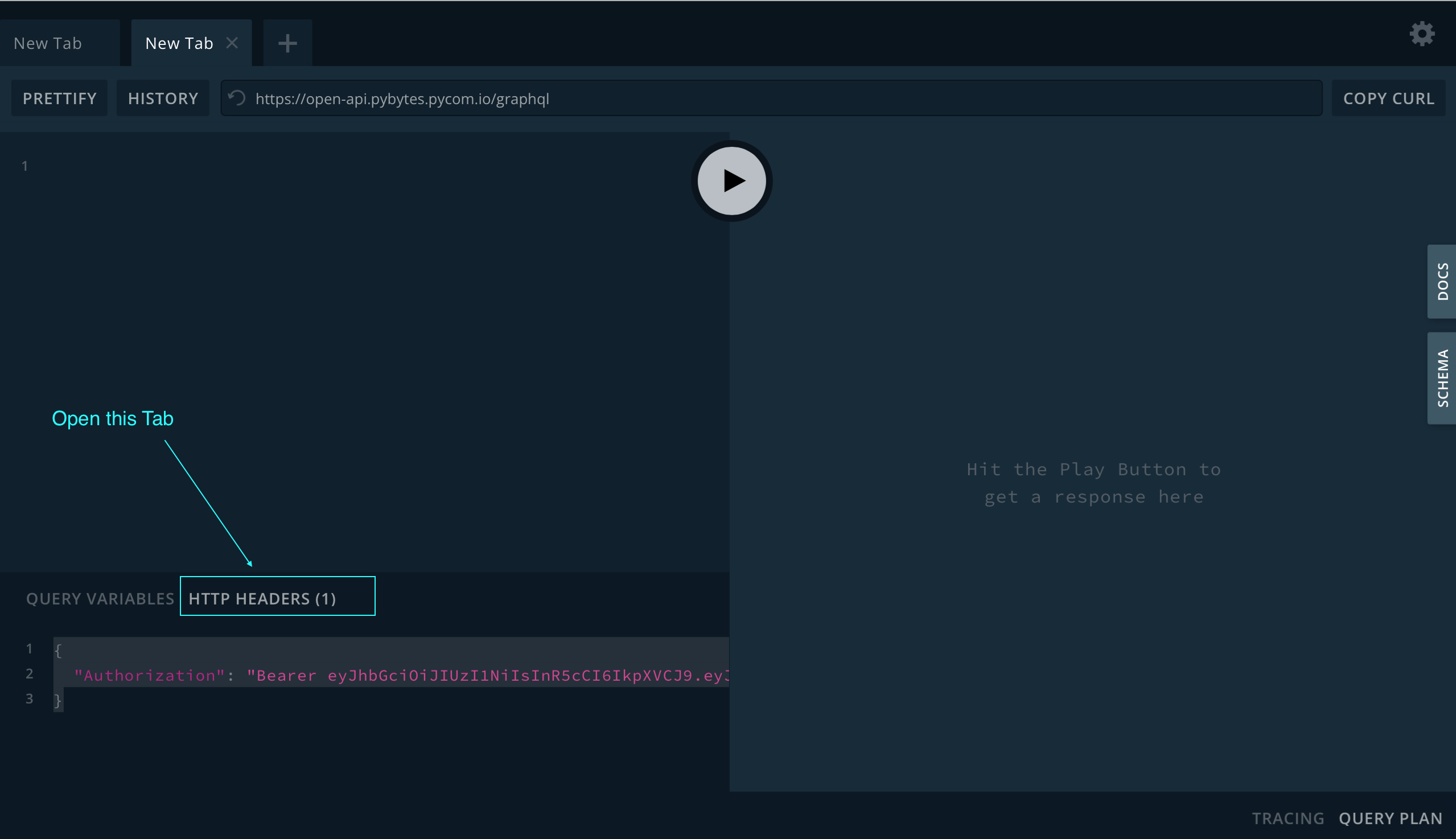 1. On the playground open the HTTP Headers tab at the bottom of the screen