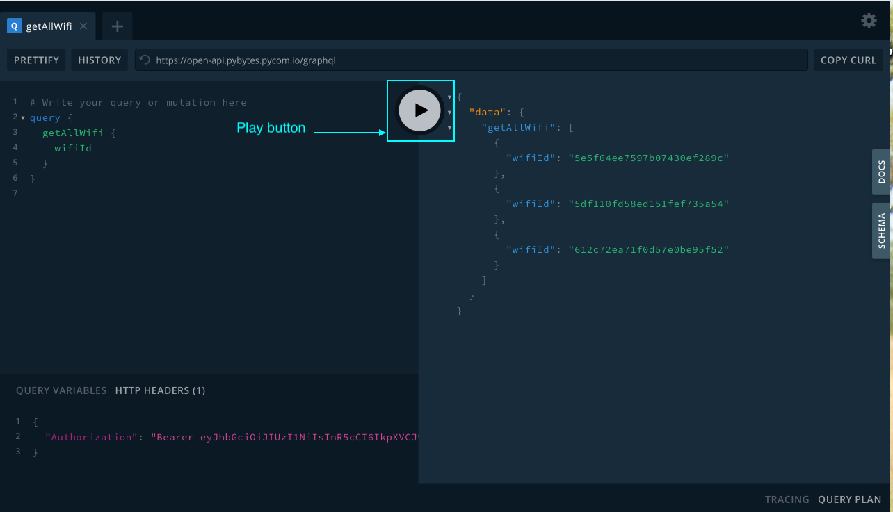 3. Now you can try to send the Query or Mutation request for a certain API function, for instance, getAllWifi query. After pressing the play button you will see the list of all wi-fi networks on the right frame of the playground