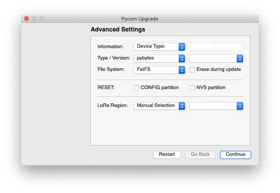 • Pygate: This firmware is needed to operate the Pygate expansionboard. It contains additional features like support for the LoRa gateway and PyEthernet. On the Lopy4, you cannot use the onboard LoRa radio. This version also includes the Pybytes library